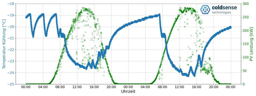 Photovoltaik-Erzeugung und Temperaturverlauf in einem Kühllager. Die Aufwärmzeit (von 16 Uhr bis 8 Uhr morgens am nächsten Tag) wird durch Senkung der Temperatur verlängert. In dieser Zeit wird kein Strom für die Kälteanlagen eingekauft. Daten eines Referenzprojekts mit einem Convenience-Food-Händler (08.-09. Juni 2024).